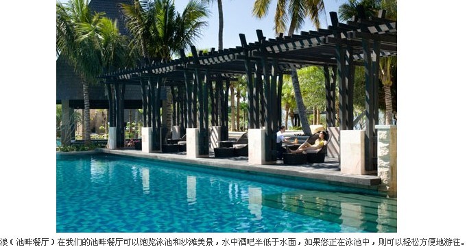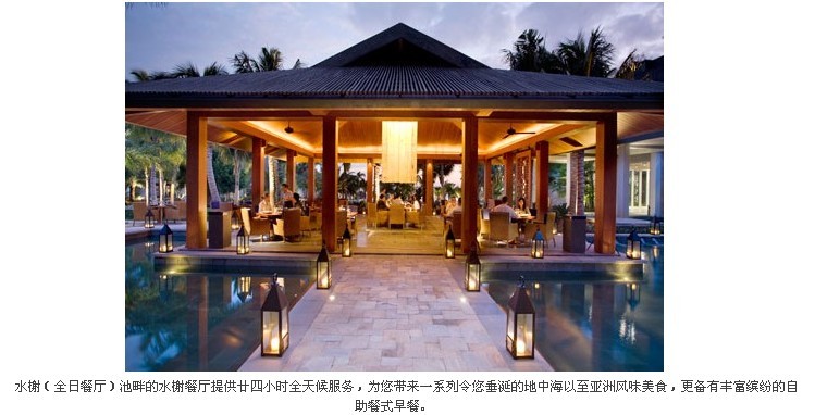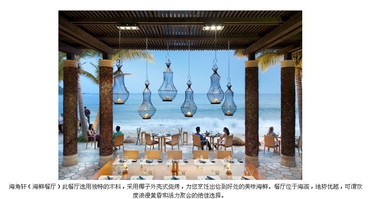 在三亚这是最适合度假的酒店之一,位置比较偏僻,在大东海的东面半岛的角落,依山傍水,独占一个海湾,也正是这样的位置,造就了酒店低调优雅的气质。这里很适合天天呆在太阳伞下把皮肤晒黑,读读小说,消磨几天的时光。服务不错,亲切而得体。酒店的餐饮环境很好,早餐比较丰富,食材非常讲究,酒店大打儿童牌——一下车,大人有鲜花环,儿童有氢气球;办理入住手续时,女士有SPA优惠券(这里的SPA超有名),儿童有沙滩玩具;第二天还有儿童礼物(儿童专用洗漱用品、沙滩排球);用餐时,儿童专用餐具;儿童康乐中心免费开放;上午免费儿童拍照;下午免费赠送儿童冰激凌。